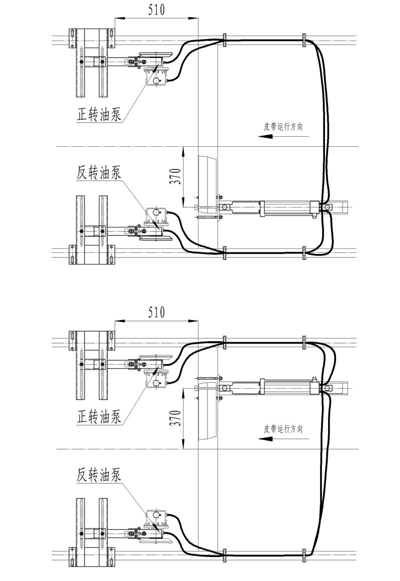 當皮帶居中運行時,皮帶與左右兩只檢測輪不接觸,屬于正常運行。如果皮帶在運行偏左邊時,啟動左動力輸出裝置,執行機構根據邏輯閥判斷調整糾偏托輥位置,產生反向推力,把皮帶推向中間一面。反之,皮帶偏右時,啟動右動力輸出裝置,執行機構根據邏輯閥判斷調整糾偏托輥位置,產生反向推力,把皮帶推向中間一面。